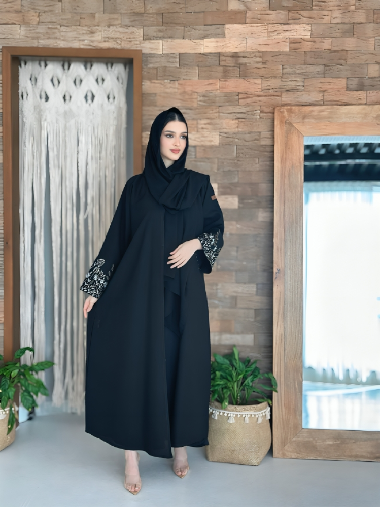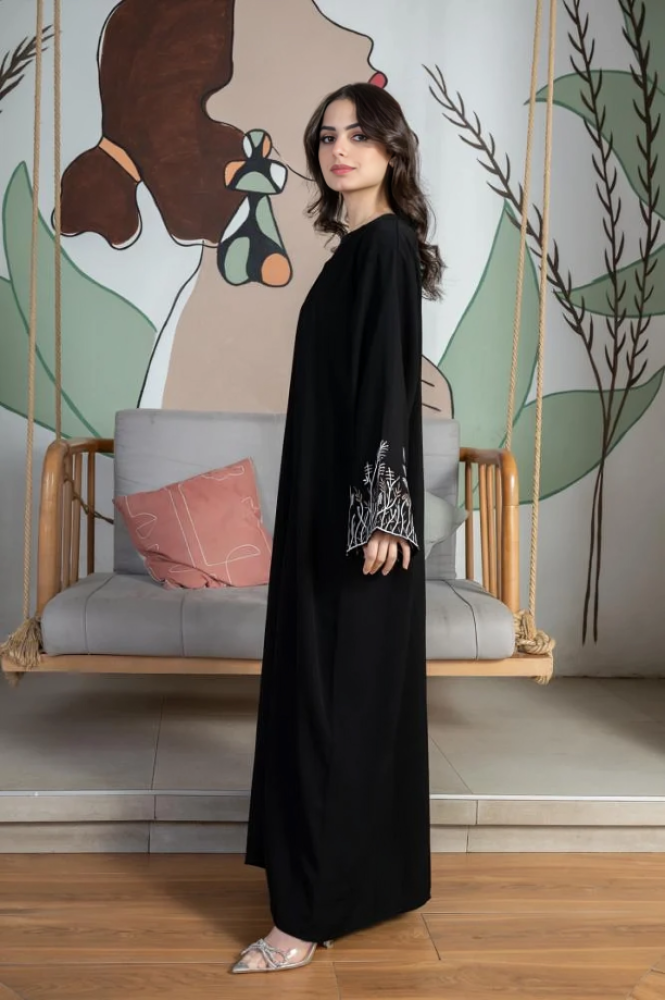 • تأتي العباية بتطريز أغصان على الأكمام يجمع بين البساطة والجمالية.