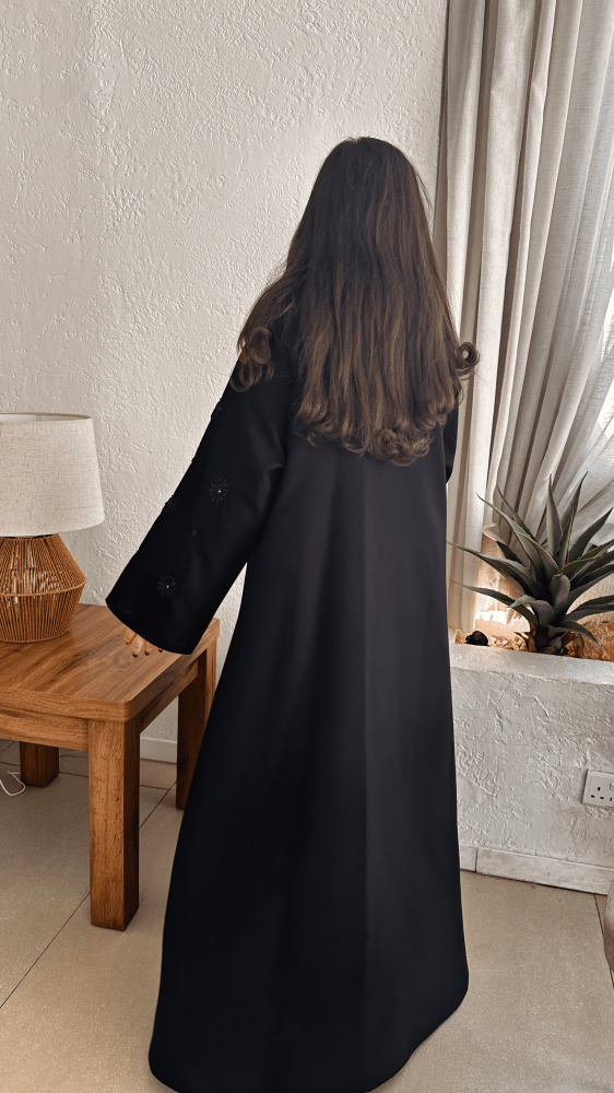 - تتميز هذه العباية بتفاصيل الخرز الرائعة علي شكل ورود علي الأكمام ، مما يضفي لها طابعا أنثويا رقيقا وهادئا.