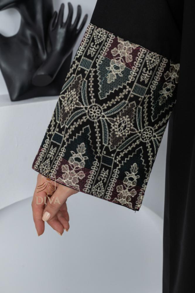 - الأكمام مزينة بكلفة أنيقة مطرزة بخيوط ملونة تعكس ذوقًا فنيًا رفيعًا.